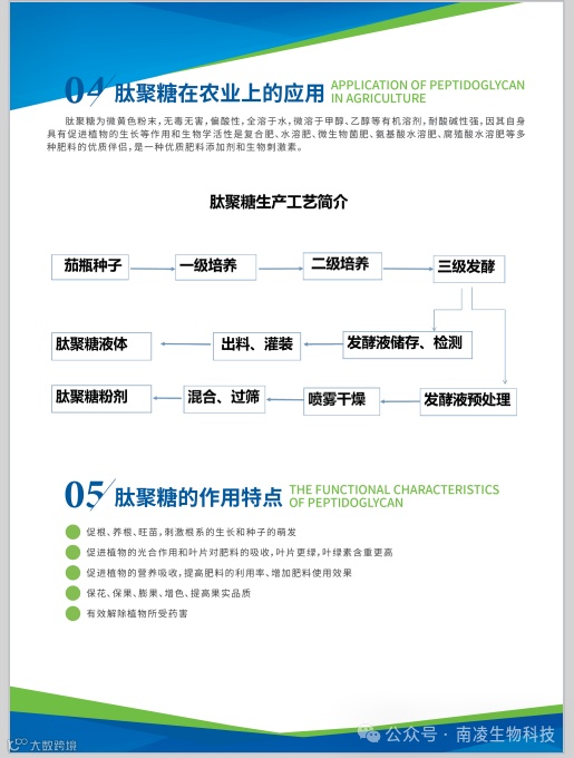 肽聚糖是一种糖蛋白,化学结构是由不同基数的糖链和肚链形成的多分子聚合物,非常稳定,具有极强的生物学活性是一种新型植物生长刺激素。南凌生物放线菌肽聚糖原粉是通过将放线菌进行发静、破碎、提取干燥而来,除含有核心成分肽聚糖外,还富含多糖、三十烷醇、黄酮、多肽、稀有活性元紧等近八十种成分,是一种绿色、安全、健康的天然产物。