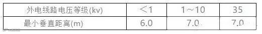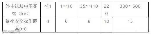 3、在建工程(含脚手架)的周边与外电架空线路的边线之间的最小安全操作距离: