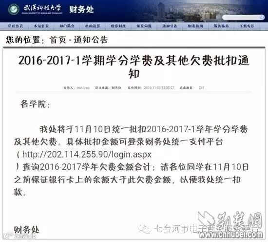 “将于11月10日统一批扣2016-2017-1学年学分学费及其他欠费,请各位同学在11月10日之前保证银行卡上的余额大于此欠费金额,以便我处统一扣款……”武汉科技大学财务处的一则通知,让该校积极备战“双十一”的同学们猝不及防,狂呼“终于知道 什么叫做计划赶不上变化”。