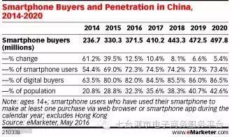 中国在POS上使用手机支付的消费者数量和去年比翻一番,eMarketer预计到2020年超过50%的中国智能手机用户使用移动支付。根据eMarketer对中国移动支付使用量的首次预测,2016年中国将有1.953亿人使用近距离移动支付,年增幅45.8%。