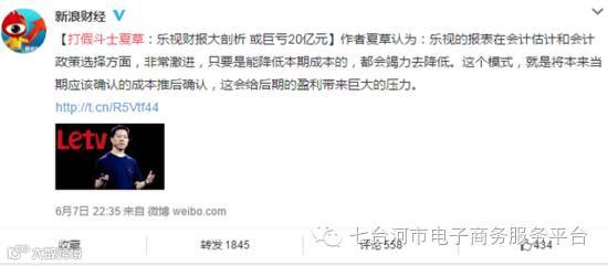 贾跃亭及乐视本身的话题性,再加上停牌6个月的乐视网上周五复牌跌停开盘后巨量资金瞬时涌入翘板的走势令《巨亏20亿》一文广受关注。新浪财经昨日22点35分发布该文章的微博后,截止到周三9:15分,已经获得了1845次转发和558次评论及434个“赞”。