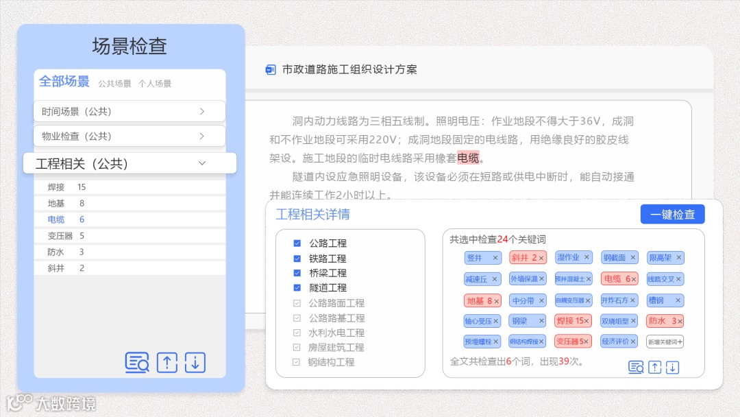 根据检查场景的设置,可检查出当前文档中的相关词汇在不同场景下是否用词妥当,并给出词组定位以及出现频次,快速排查出所在场景中的词汇错误