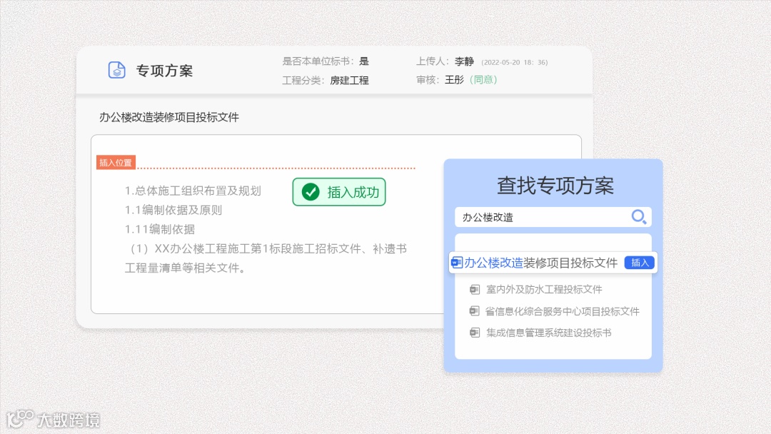 上传并保留企业往期成功方案,使用时可随时选择插入到当前文档,丰富标书内容,提高内容质量