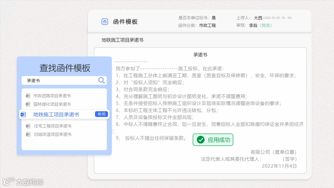 积累并管理大量优质的标书模板,可按需应用相应的模板,套用模板快速制作出优质的标书