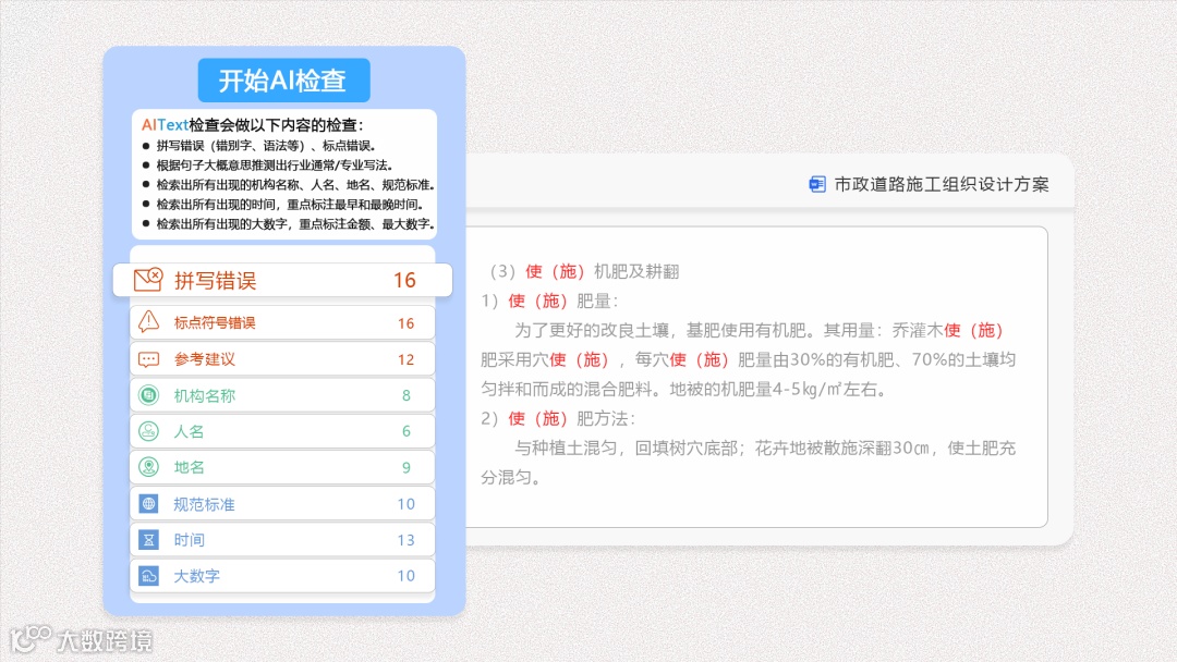 AI检查提供了常见错别字、标点错误检查、AI建议、机构名称、人名、地名、时间以及大数字提取,一键快速智能检查出标书问题,有效提升标书准确率