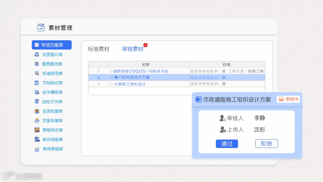 海量素材有序管理,支持自定义素材审核流程,通过方案、图片、图表、表格等知识素材积累,打造专属资源库
