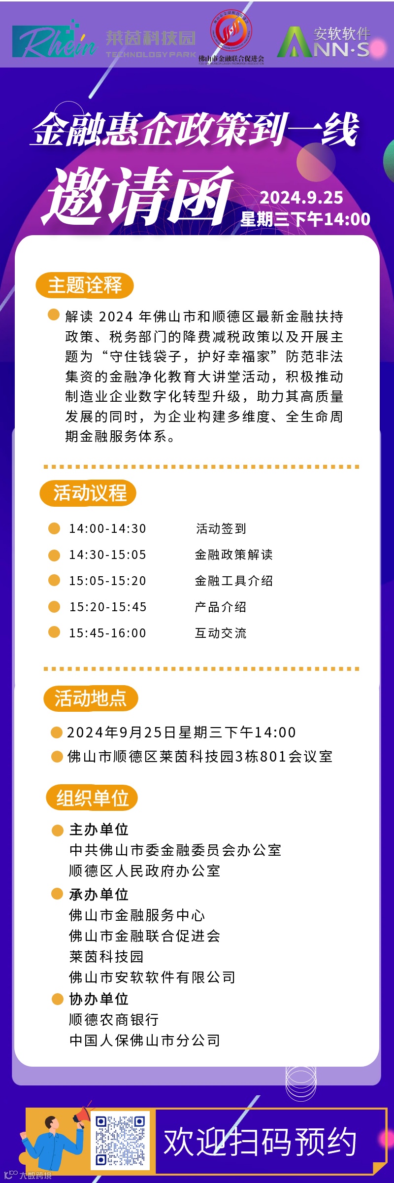 佛山市作为全国重要的制造业基地,制造业是佛山经济发展的根本。服务实体经济,服务制造业,始终是佛山金融坚持的发展、服务宗旨。为佛山“515战略”目标作出新贡献,围绕“金融服务实体经济”的核心,致力于金融服务的精准性、直达性、便捷性。受佛山市委金融办委托,由佛山市金融联合促进会承办的“金融政策到一线”系列活动(顺德莱茵科技园专场),具体如下: