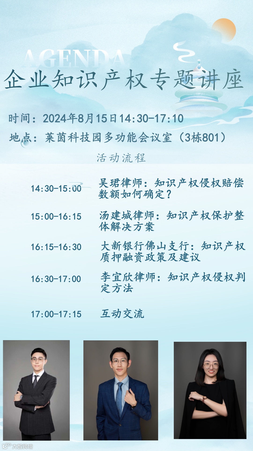 知识产权是企业创新与智慧的结晶,更是市场竞争中不可或缺的“隐形铠甲”。为了助力园区企业把握时代脉搏,强化知识产权战略布局,增强园区企业的知识产权权利意识和法律风险防范意识,莱茵科技园计划于2024年8月15日举办一场“知识产权赋能未来”知识产权专题培训讲座。