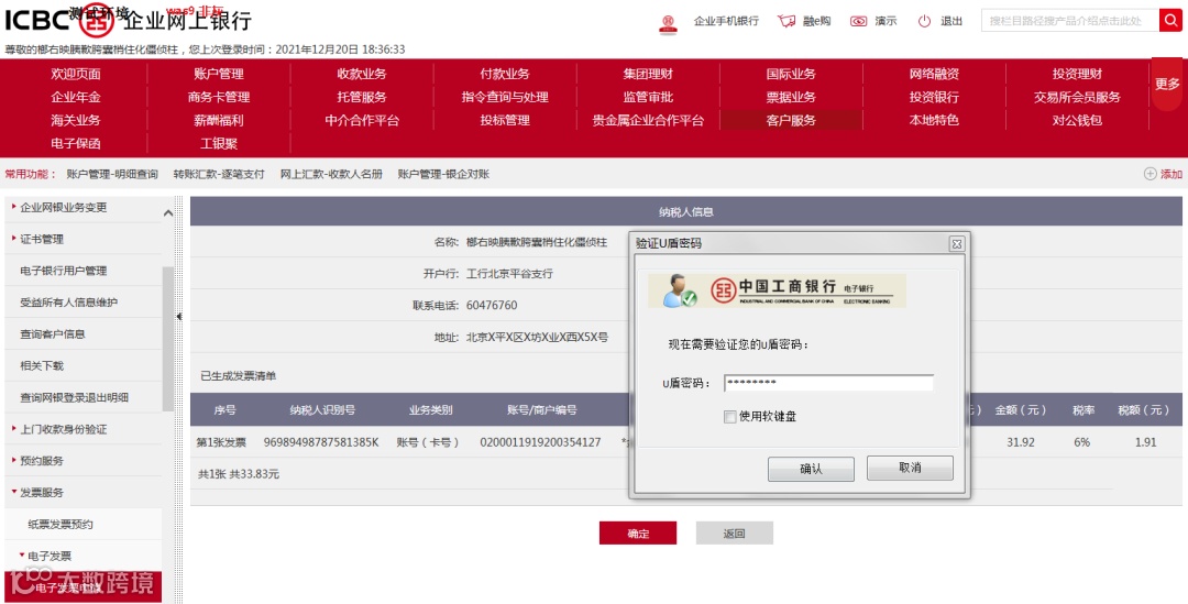 三、确认相关纳税人信息及发票信息准确,点击“确定”,输入U盾密码,再点击“确定”。