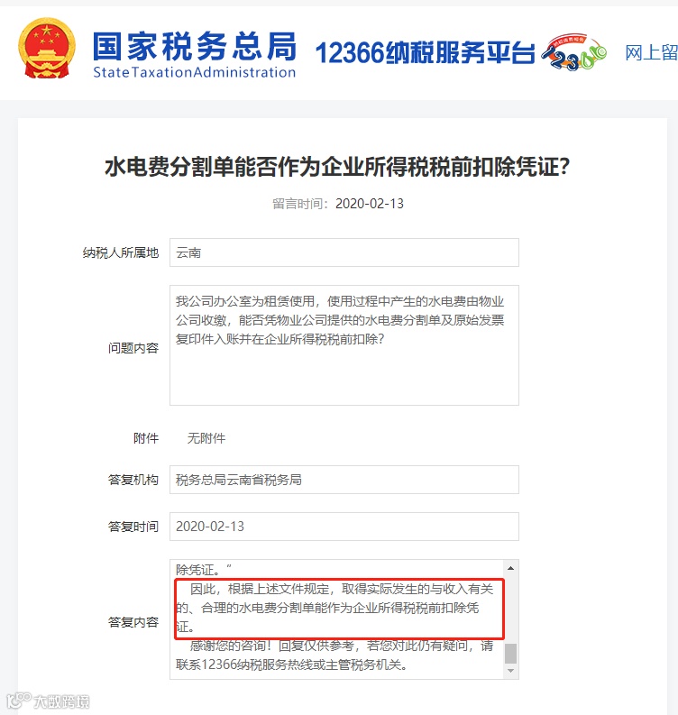 其实,水电费分割单能否作为企业所得税税前扣除凭证?税局也有明确回复