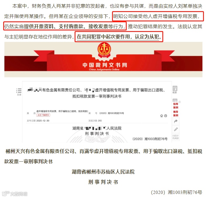 最近在网络上看到一个案例,财务人员所在的单位涉嫌虚开,但是由于增值税专用发票的领用、开具和抵扣通常属于财务人员的工作范围,财务人员难逃此咎,法院将依据其在犯罪行为中所起的作用认定其为从犯,最终被判刑3年。