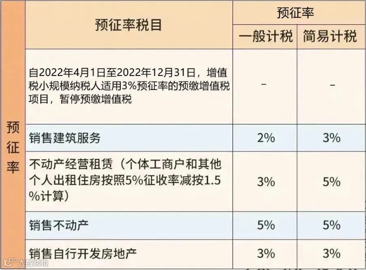 目前主要针对不动产和建筑行业采用预征办法,主要有5%、3%和2%的档次。