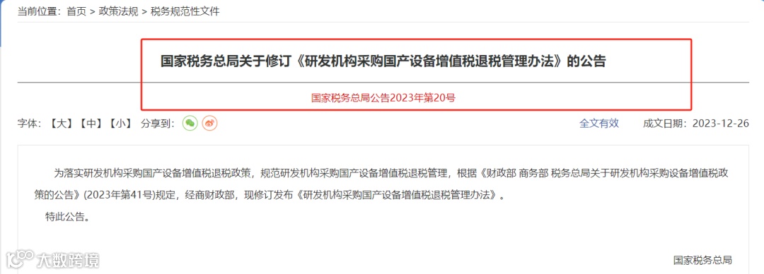 国家税务总局发布《研发机构采购国产设备增值税退税管理办法》的公告。