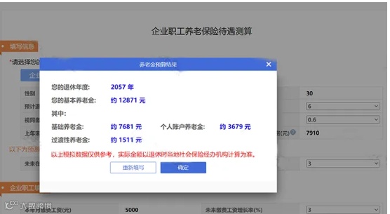 (注:这个计算器,只是根据我们的假设数据,推算出最终退体金。实际情况,可能和我们推算的会有差别,因此,只能做个参考,大致了解一下。举例仅供参考,每个人的养老金根据当地工资水平、缴费年限、缴费档次的不同,而不一样。)