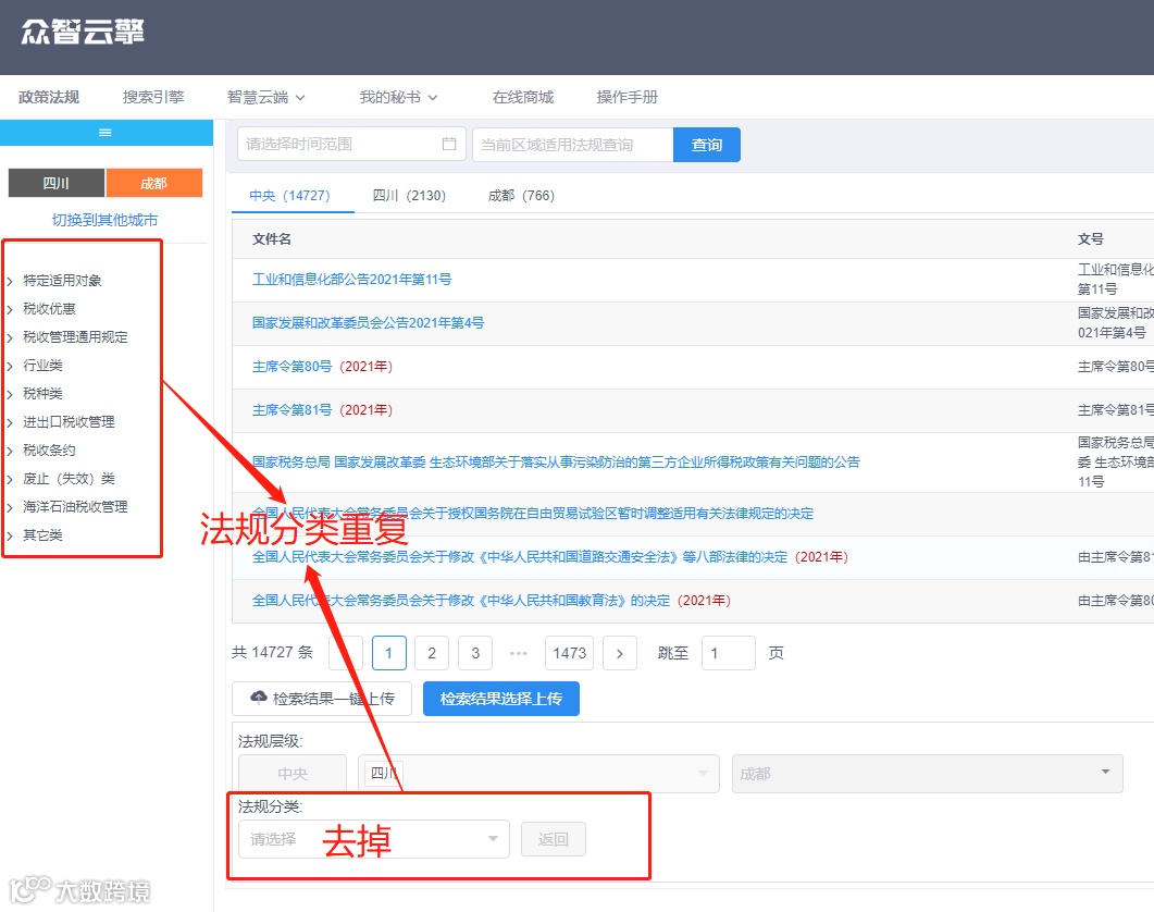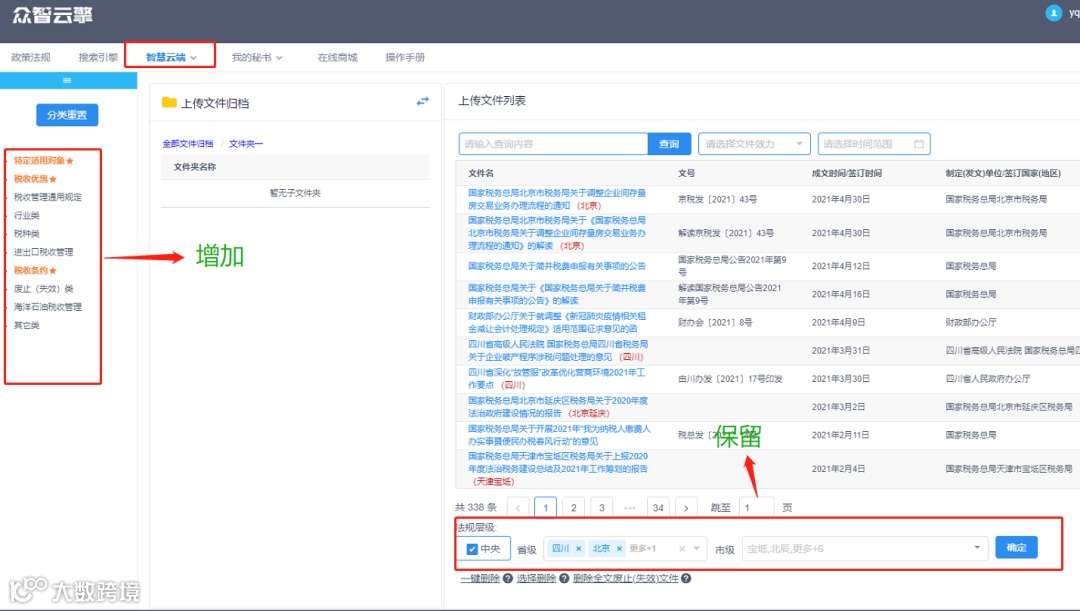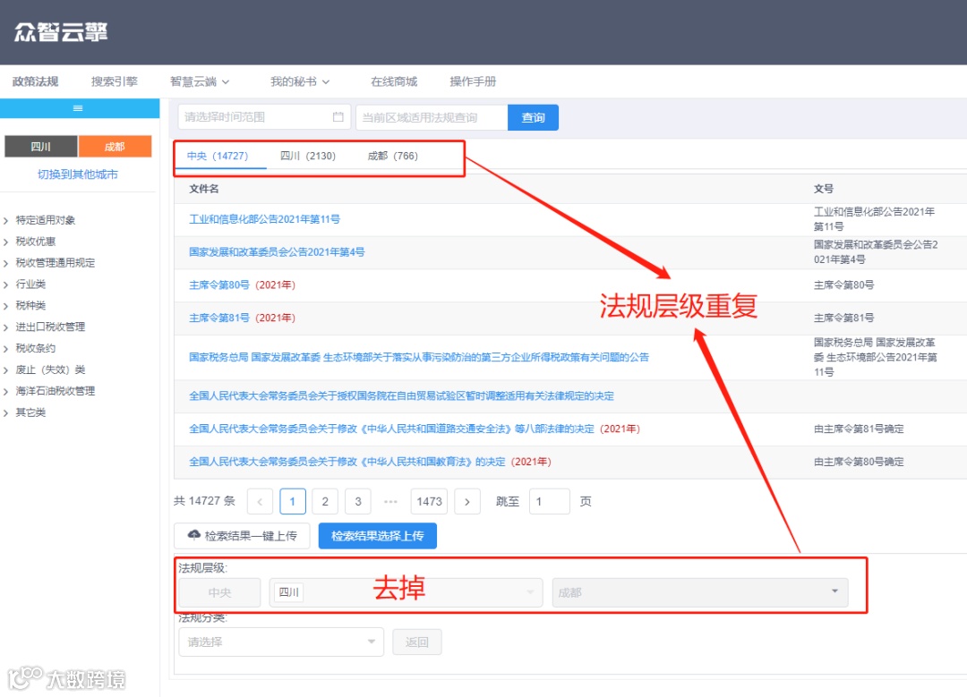 1、取消了旧版本中“政策法规”下检索页面的“法规层级”,选择保留文件名上方的“法规层级”——中央、省级、市(州)。
