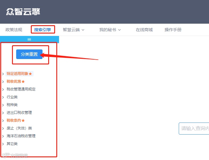 2、在“法规分类树”中增加了“分类重置”功能,便于用户快速回到查询起始状态。