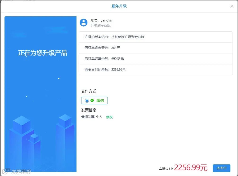 举个例子:王先生购买了一年的基础版,支付了698元,在订单还剩余361天的时候想升级为专业版。