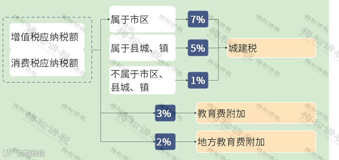 附加税是对增值税、消费税附征的一种税费,包括城建税、教育费附加和地方教育费附加(后两者属于费),税率分别是: