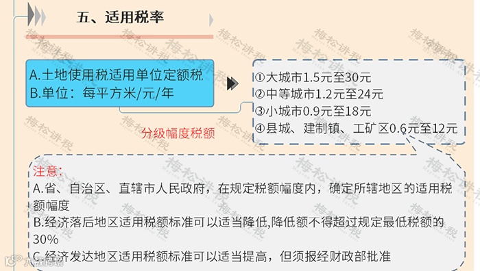 城镇土地使用税是对在城市、县城、建制镇、工矿区范围内使用土地的单位和个人征收的税种。适用税率如下: