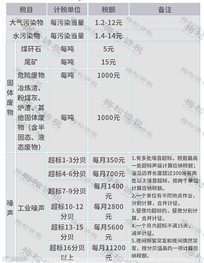 环境保护税,是对在中国领域内和中国管辖的其他海域排放应税污染物征税的税种。污染物分为大气污染物、水污染物、固体废物、噪声这4种。适用的税率如下: