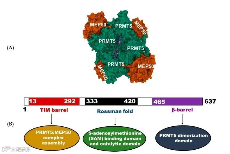 这种独特的 PRMT5:MEP50 复合物会进一步与多个伴侣蛋白相互作用,如RioK1,menin,pICLn等,从而实现多种底物特异性和生物功能。PRMT5是细胞中主要的sDMA形成酶,N端为 TIM桶状结构蛋白(TIM barrel),主要负责PRMT5和MEP50复合物的组装,TIM barrel与MEP50结合形成活性更高的复合体。;中间为1个Rosssman折叠,主要包括小分子结合结构域和催化结构域;C端是β-barrel结构域,在PRMT5蛋白自身的二聚化起到重要的作用,结构域示意图如图3B所示。