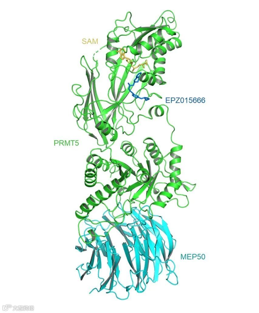 人类PRMT5蛋白由637个氨基酸组成,通常与甲基化组蛋白 50(MEP50)结合成一个 435kDa的异八聚体复合物。MEP50 是一种含色氨酸-天冬氨酸(WD)重复蛋白,可稳定PRMT5蛋白复合物并增强其甲基转移酶活性。因此,PRMT5蛋白会寡聚化形成内核四聚体,周围的四个MEP50蛋白分子与PRMT5蛋白的N端结合,如图3A所示。