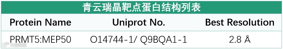 青云瑞晶已完成PRMT5蛋白靶点的蛋白表达和结构解析,成功解析了PRMT5:MEP50+SAM+ EPZ015666复合物结构(PDB ID:4X61)。基于这些实验条件和库存蛋白,青云瑞晶将项目的交付时间缩短至1-2个月,并确保项目的成功交付。