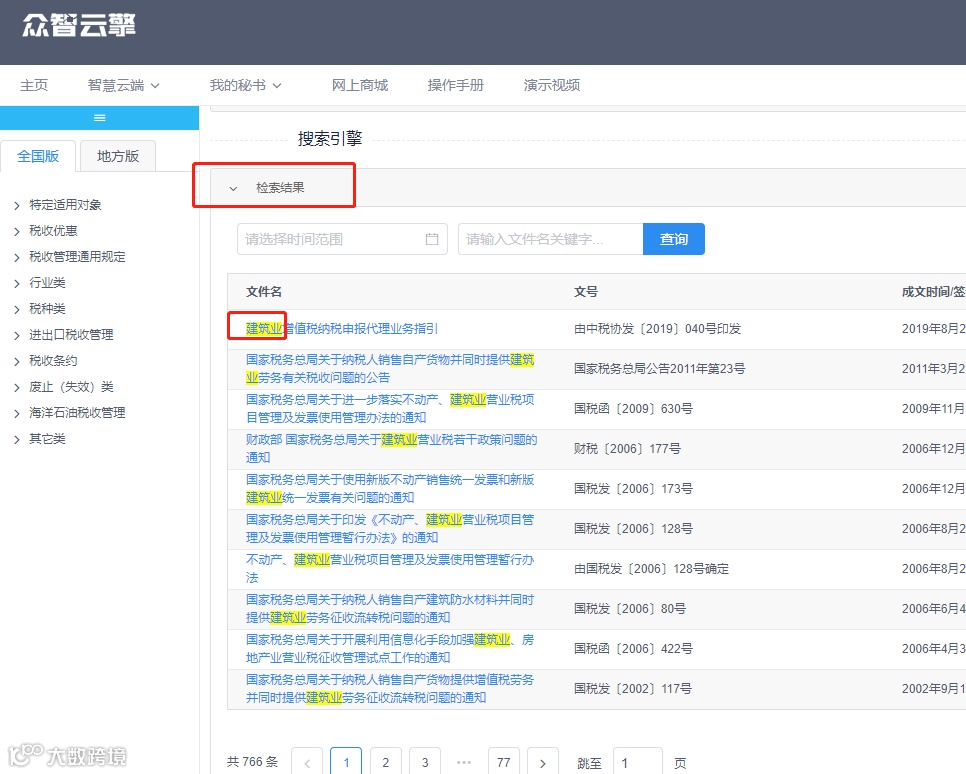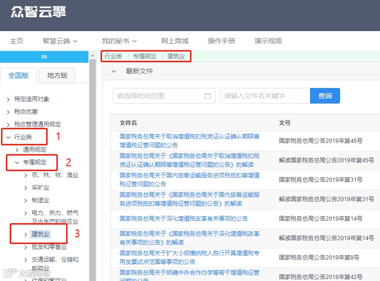 建筑行业,如何用众智云擎查找相关税法文件?