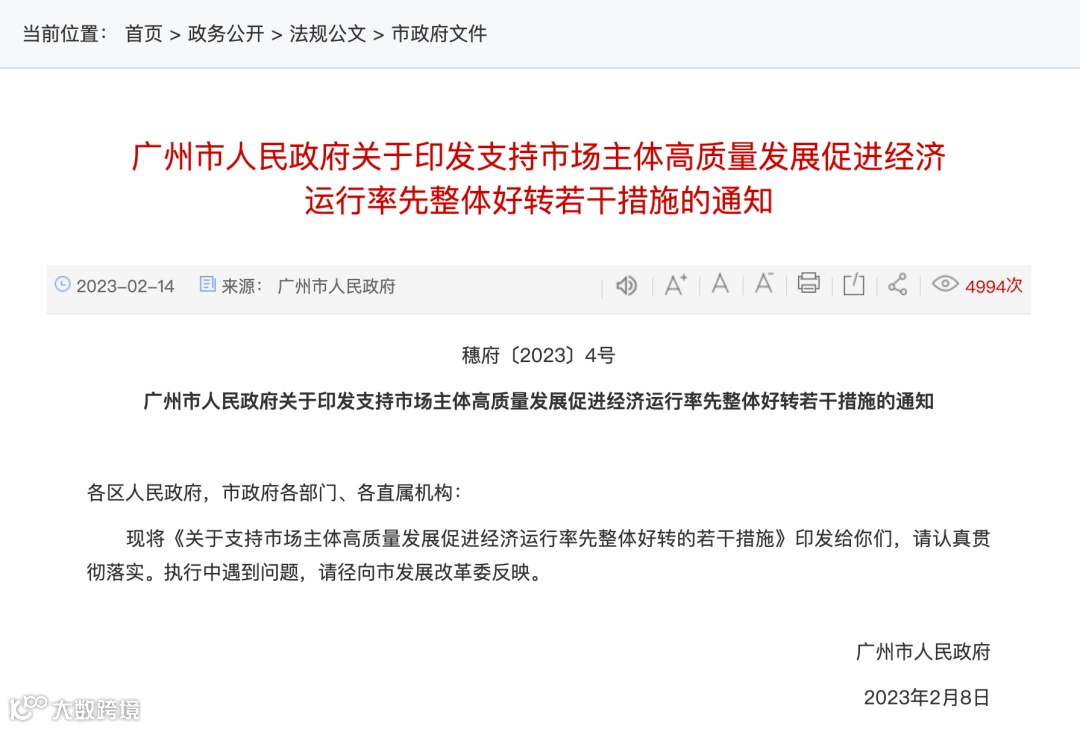2023年2月,广州市发布《关于支持市场主体高质量发展促进经济运行率先整体好转的若干措施》。