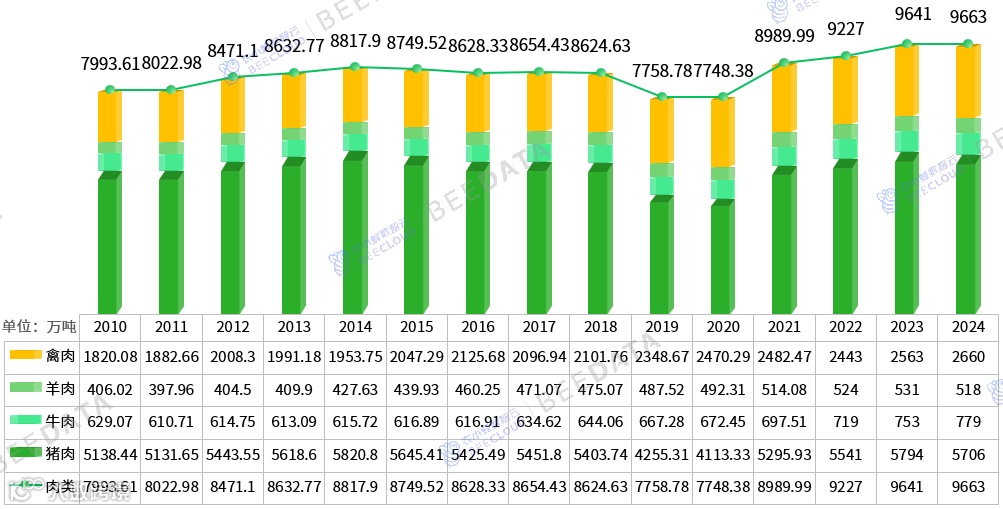 2024年,人们对肉类产品的需求依然旺盛,但受进口冲击、市场行情波动、替代消费等综合因素影响,国内大宗畜禽存、出栏量均有所波动,肉类产量也随之同步变化至9663万吨,同比增长了0.2%。其中,猪肉产量为5706万吨,同比下降了1.5%;牛肉产量为779万吨,同比增长了3.5%;羊肉产量为518万吨,同比下降了2.5%;禽肉产量为2660万吨,同比增长了3.8%。