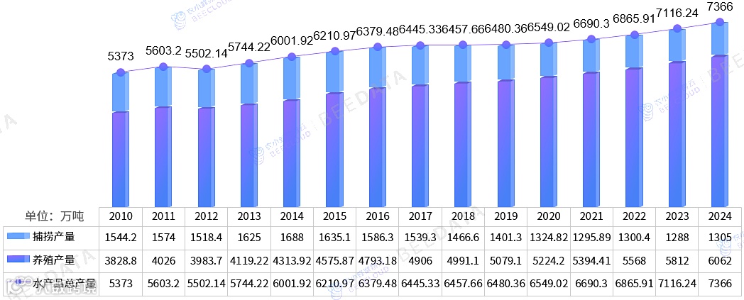 据国家统计局数据显示,中国水产品总产量70%以上来自养殖产量,2010年以来,除2012年外,中国水产品总产量均随养殖产量同步呈现逐年增长态势,2024年已增至7366万吨,同比增幅约3.5%;捕捞产量则受资源限制、气候变化以及休渔、禁渔和减船转产政策等综合因素影响,整体呈现波动下降趋势。