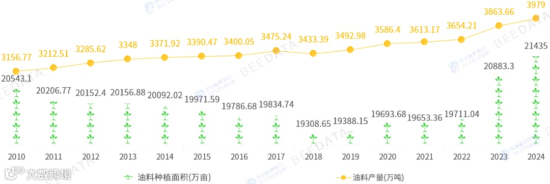 2024年,中国油料种植面积为21435万亩、产量为3979万吨,同比分别较2023年增加了2.64%、2.99%,生产品种以油菜籽、花生为主。结合历史数据来看,2010年以来,中国油料种植面积已于2022~2024年间连增3年;产量则得益于单产水平的提升,除2018年外均保持持续增加态势。