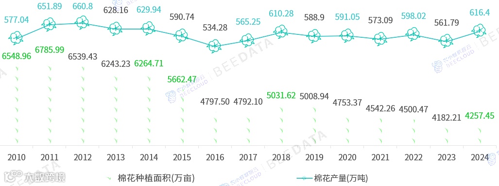 近年来,因植棉收益不佳,农户转种其它作物,国内棉花种植面积整体减少,棉花产量也随之波动下降。2024年,中国棉花种植面积为4257.45万亩、产量为616.4万吨,受年际间气候以及收购价格波动等综合因素影响,同比分别较2023年回升了75.24万亩、54.61万吨,升幅分别为1.8%、9.72%。