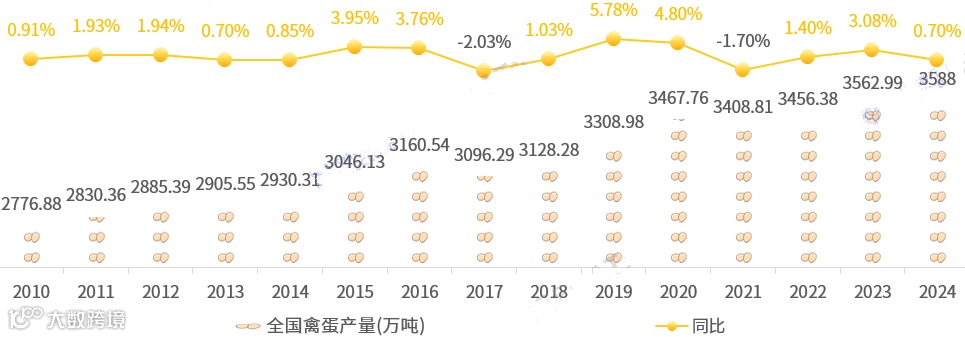 据国家统计局数据显示,2010年以来,中国禽蛋产量仅在“2017年、2021年”出现过小幅同比下降趋势,其余年份整体呈正增长态势,2022年~至今已连增3年。2024年,中国禽蛋产量为3588万吨,同比较2023年增加了0.7%。