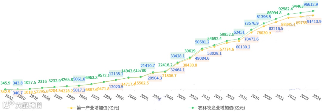 从长期趋势来看,1952年以来,除“1957年、1959年、1960年、1976年、1977年、1999年”外,全国“第一产业增加值、农林牧渔业增加值”均呈正增长态势——目前已连增25年,这表明中国农业在经济发展中发挥了重要作用。