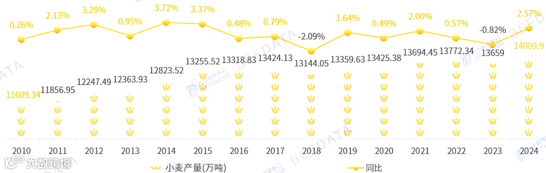 2024年,中国小麦产量为14009.9万吨,同比增长了2.57%,创历史新高。