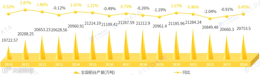 2024年,中国稻谷产量为20753.5万吨,同比增长了0.45%——为2022~2023年连降两年后的首次回升。