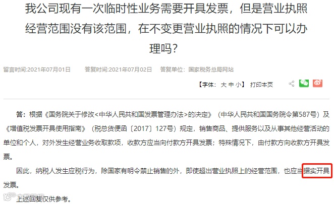 2.企业某项业务如果是长期超经营范围的,应当先去市场监督管理部门增加经营范围,再考虑税务处理流程。