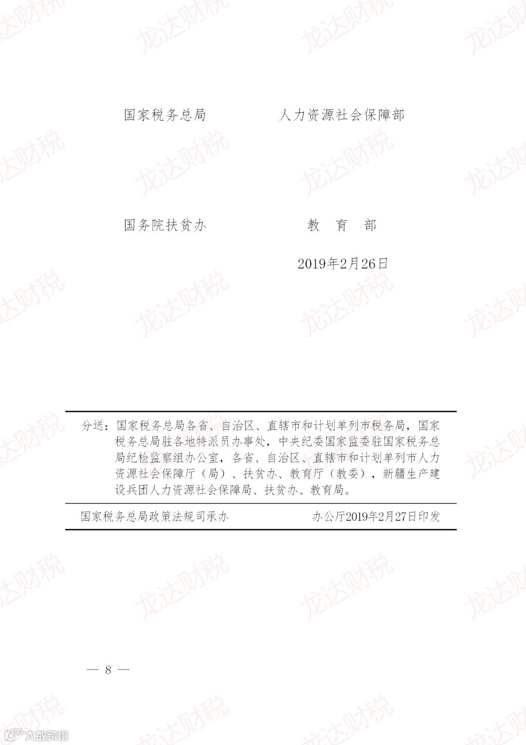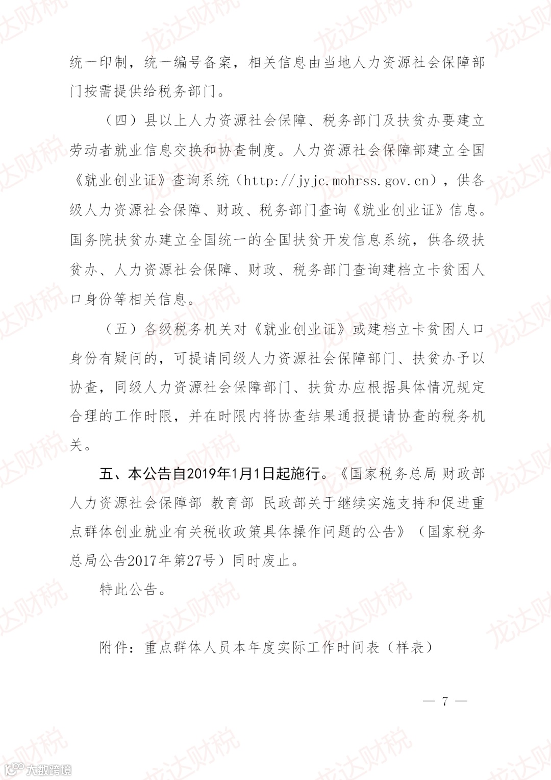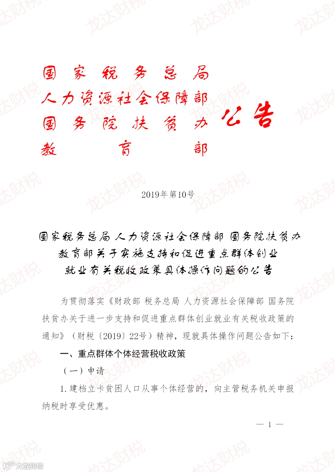 为贯彻落实《财政部 税务总局 人力资源社会保障部 国务院扶贫办关于进一步支持和促进重点群体创业就业有关税收政策的通知》(财税〔2019〕22号)精神,国家税务总局人力资源社会保障部国务院扶贫办教育部发出了公告。