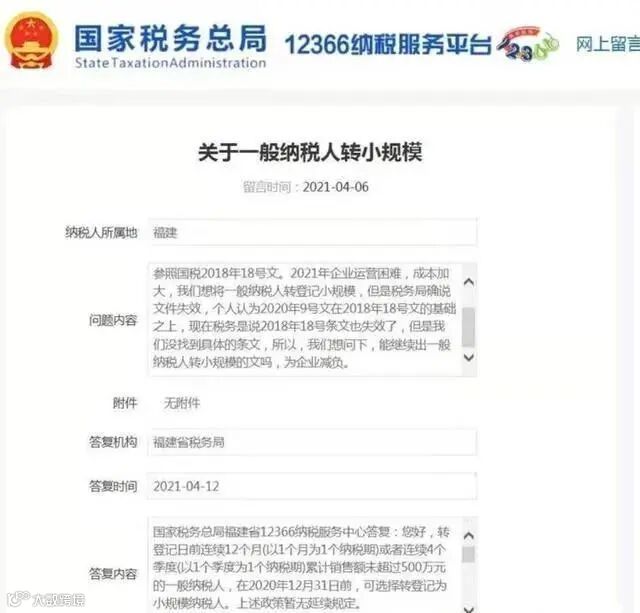 国税局给出的回复:一般纳税人符合条件的,在2020年12月31日前,可选择转登记为小规模纳税人!