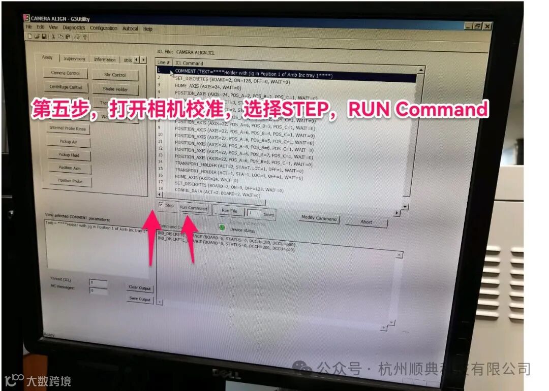 2、初始化完成后点击OPEN-CAMERA ALIGN-文件加载后打钩选中Step,鼠标点到第一步-RUN Command-一步一步点,点到第七步的时候会看到,传送架叉子伸到相机里,TOP灯泡亮着的
