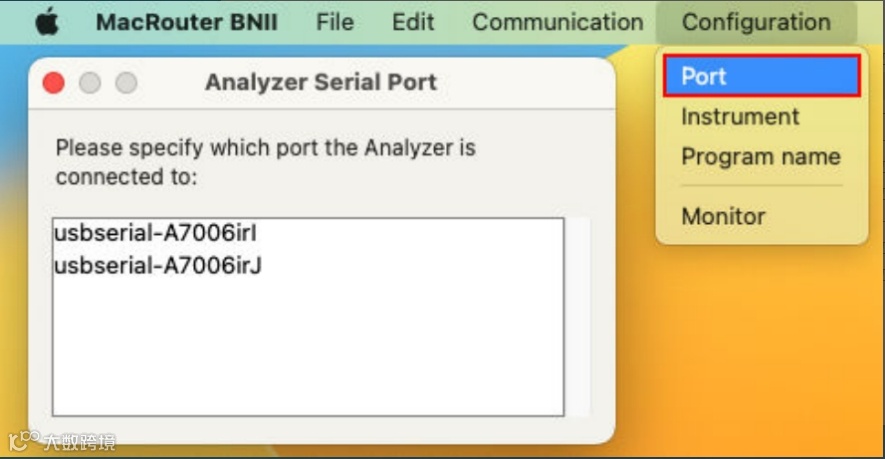 1、从MacRouter BNII菜单栏中点击Configuration > Port,选择端口(在大多数情况下,在字符串末尾带有较低数字或字母的端口名称表示端口1),关闭对话框