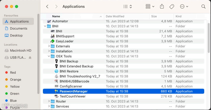 2、将BNII Troubleshooting添加到工具栏:Macintosh HD.Favourites > Applications > BNII > OSX Tools.将BN II Troubleshooting V2_7拖动到工具栏