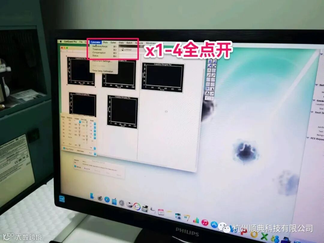 FSC散点图先调E0.E1让图像出现,在调系数让波峰出现在400左右。其他的都只调电压让波峰到400左右(不调系数)。