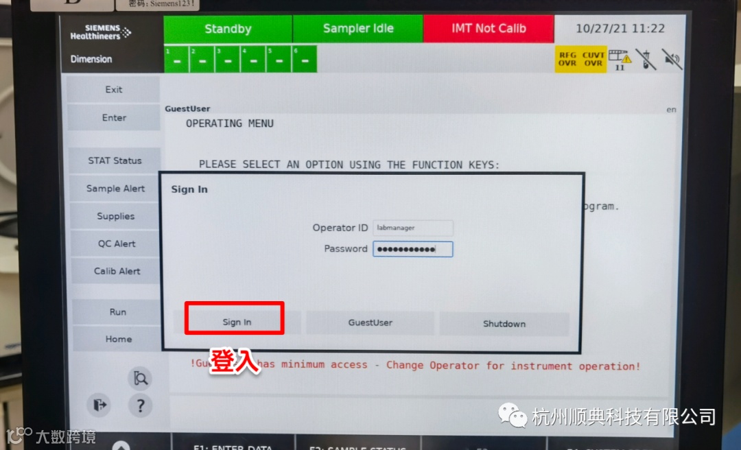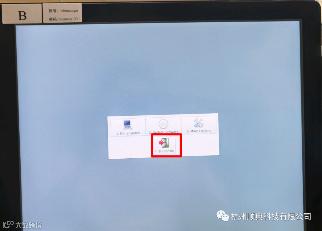关机后等待30秒以上再开电源—等待到图标界面点Dimension—等待进入软件—按Alt+EXIT—点Change Operator—输入账号:labmanager 密码:Siemens123!(屏幕左上方有贴)—点Sign In登入。