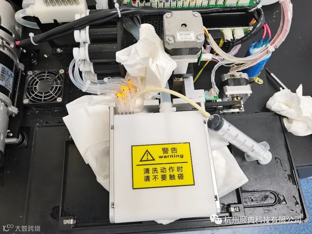 然后从有侧面拿注射器打水试试看能不能通,下面垫好纸巾,如果还是不行的话就需要拆开仪器的外壳,然后拆开对应的堵孔的打水管,用注射器套一根软管接上,右侧面的大螺丝也打开,注射器加满蒸馏水往外打水,把里面的脏东西冲出来。然后再把右侧面大螺丝拧紧,直接用注射器打水看刚刚堵孔的位置有没有通,基本上这样冲完都能够疏通。完事后复原仪器开机测试,如下图:
