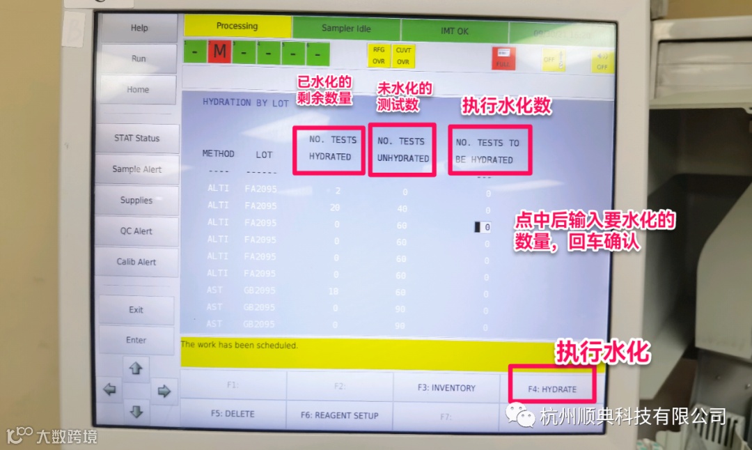 点中需要水化的试剂后面,执行水化数这一列的0,输入想水化的个数(水化是按最小一个水化单位进行水化的,例如:一条试剂60个测试,分三个水化单位,一个单位就是20个测试,当输入的水化数≤20时,则执行水化数是20;20<数值≤40,则执行水化数是40。),然后回车确认,再按F4开始执行水化。