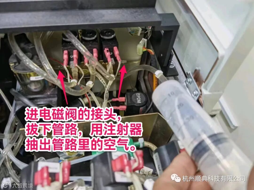 拔过管路或者更换过泵头,都会导致管路里进入空气,可以拔下电磁阀左或者右接头上的管路,用注射器抽掉管路里的空气。