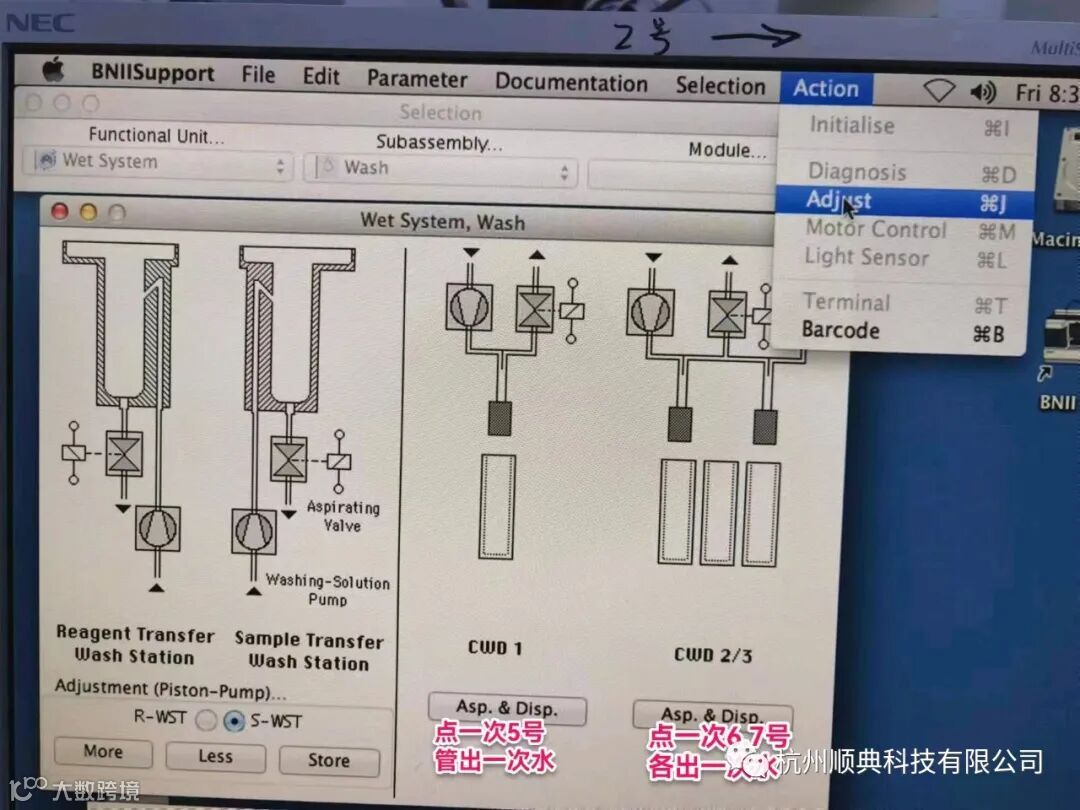 BNII反应杯清洗,由两个打液泵控制三个清洗头:上打液泵——电磁阀左侧接头——左电磁阀——5号管路——左1号清洗头(CWD1)。