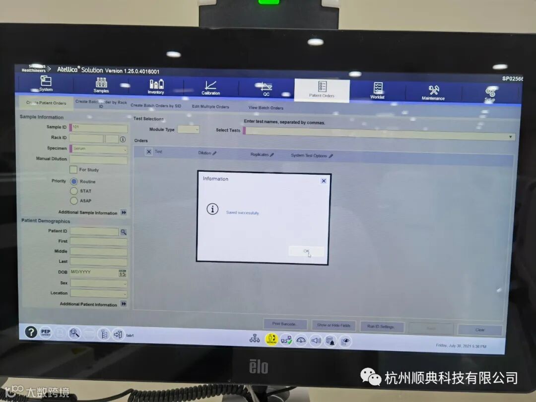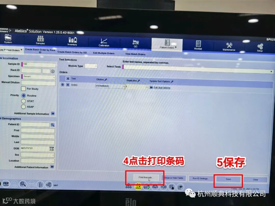 杭州顺典科技有限公司Patient Orders——在Sample ID输入编号——Select Tests选择项目——Print Barcode...打印条码——Save保存